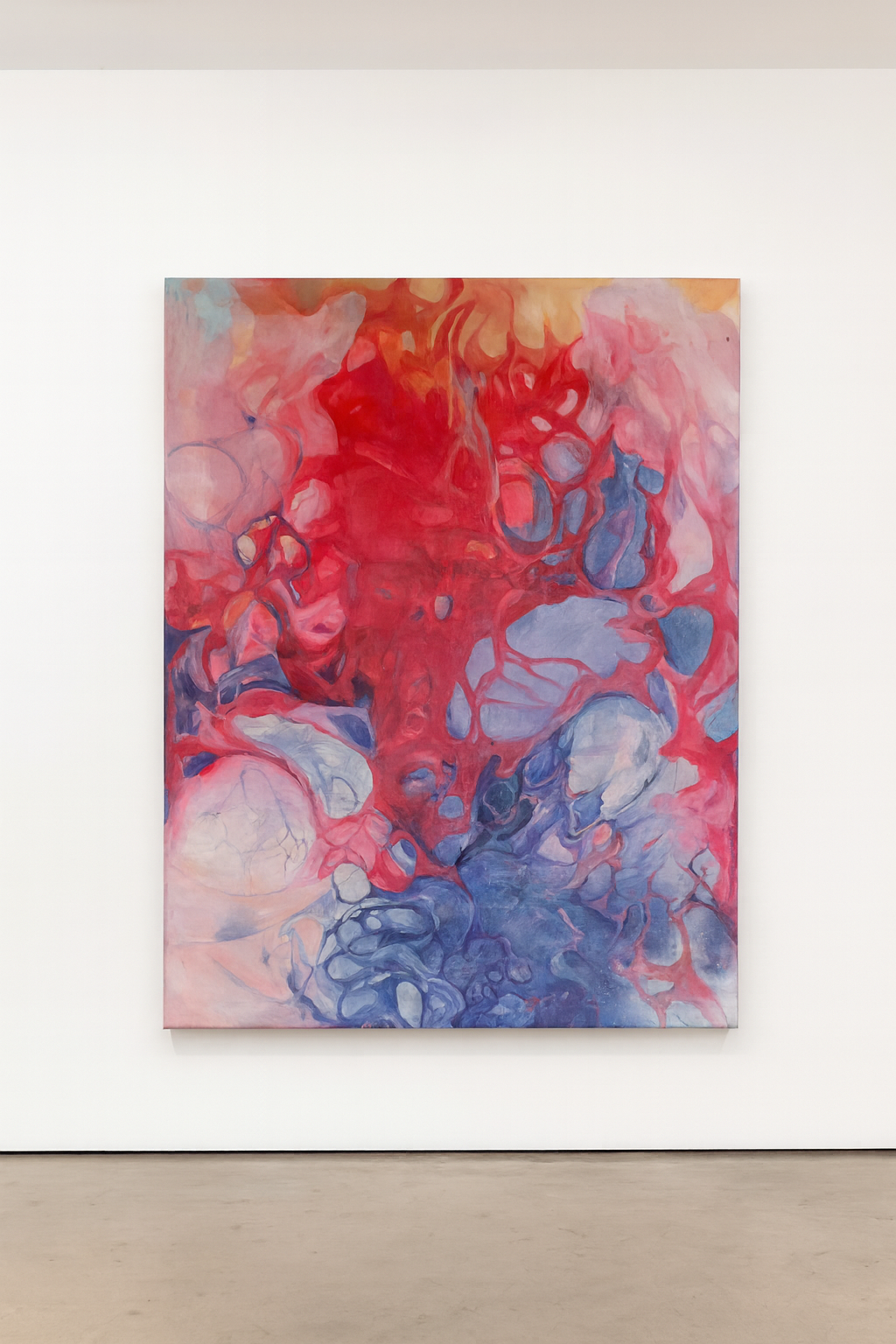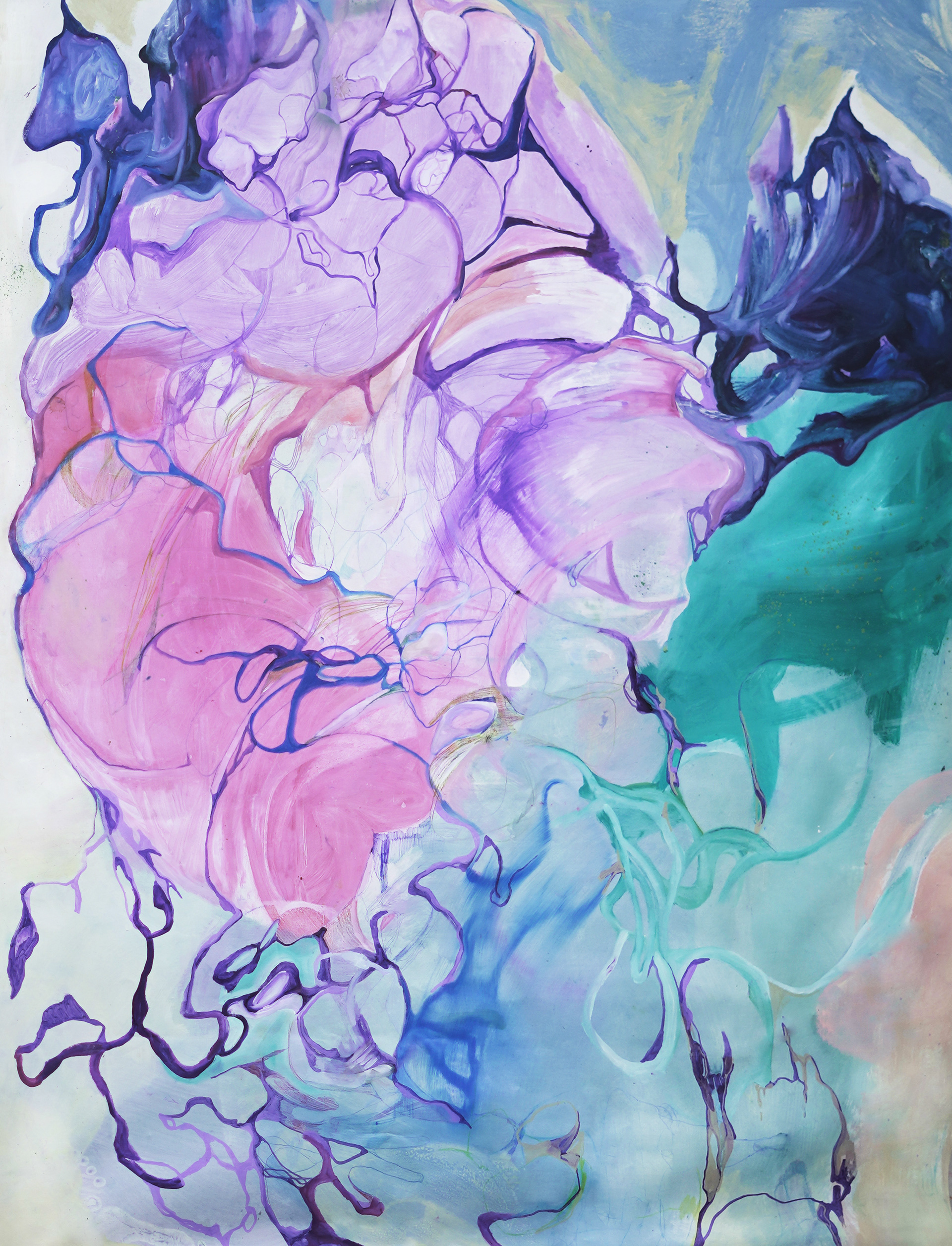 My painting grows out of automatic drawing, scaled up to large formats so that the gesture can unfold with full intensity. I work directly on canvases laid out on the floor—sitting on them, kneeling, walking across them—allowing the body to lead the line faster than thought. The physicality of the process is essential: movement, pressure, weight, and breath become part of the composition. These works function as enlarged traces of impulses, eruptions, and vibrations, and the act of painting itself becomes a way of releasing tension—a physical, emotional, and intuitive form of letting go.